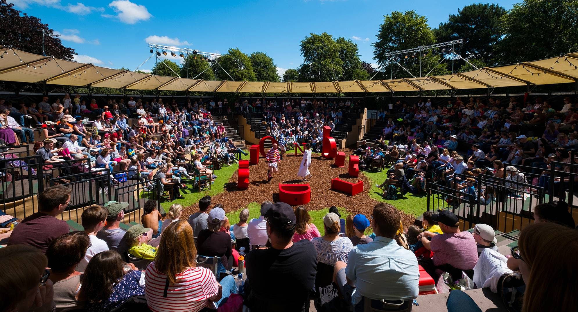 Grosvenor Park Open Air Theatre is open-air, in-the-round and has reserved seating in wide bench-style tiered terrace seating plus directors chairs at ground level.